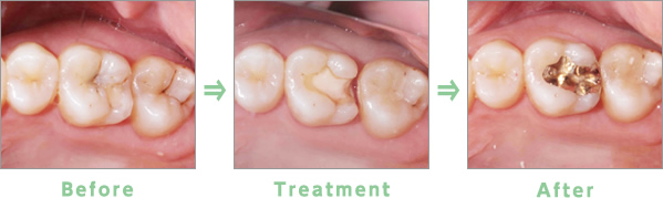 虫歯治療で感染した象牙質を除去した部位には、コンポジットレジン修復、インレー修復、クラウン修復にて失った歯牙を回復します。保険治療で使用する金属は金銀パラジウム合金を使用します。見た目は良くないですが、機能改善には全く問題ありません。