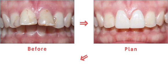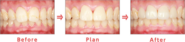 Plan:切歯はジルコニアセラミック、側切歯はラミネートベニアを計画。