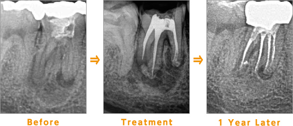 Before:根管の先に膿が溜まり、黒く(透過像)なっています。