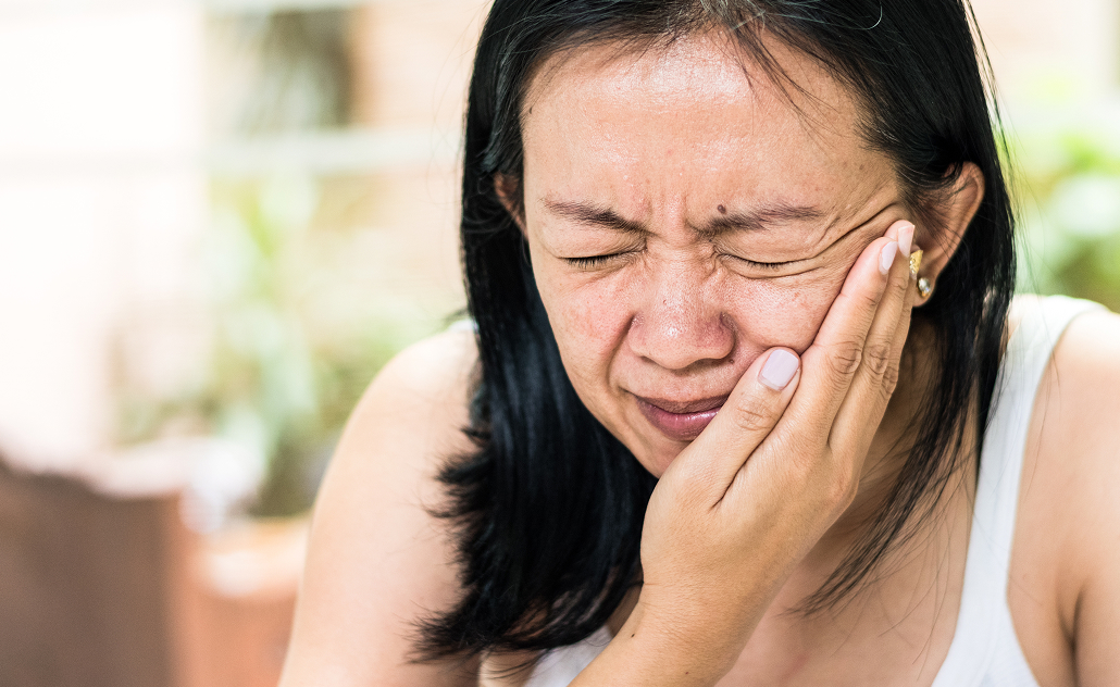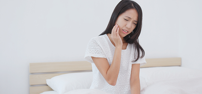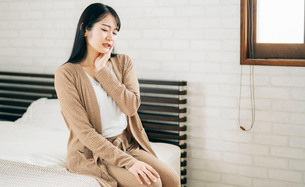 いわゆる「筋肉痛」です。口を開け閉めする際に頬のあたりやこめかみのあたりが痛く感じます。朝方に痛む方は夜間の「歯ぎしり」が原因となっている場合が多いです。またカラオケのしすぎや日常以上の会話によっても筋肉痛が起こる場合があります。